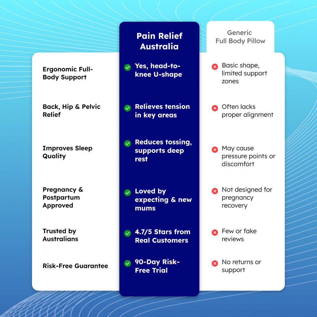 The pillow helps support more comfortable positioning only and does not treat or cure any condition. If you live with ongoing pain or other health concerns, seek personalised advice from a qualified professional.
