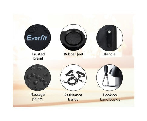 In the Box: Vibration machine platform, resistance bands, remote control, and user manual