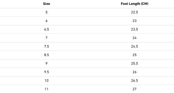 Sizes: AU Women’s 5 (22.5cm), 6 (23cm), 6.5 (23.5cm), 7 (24cm), 7.5 (24.5cm), 8.5 (25cm), 9 (25.5cm), 9.5 (26cm), 10 (26.5cm), 11 (27cm).